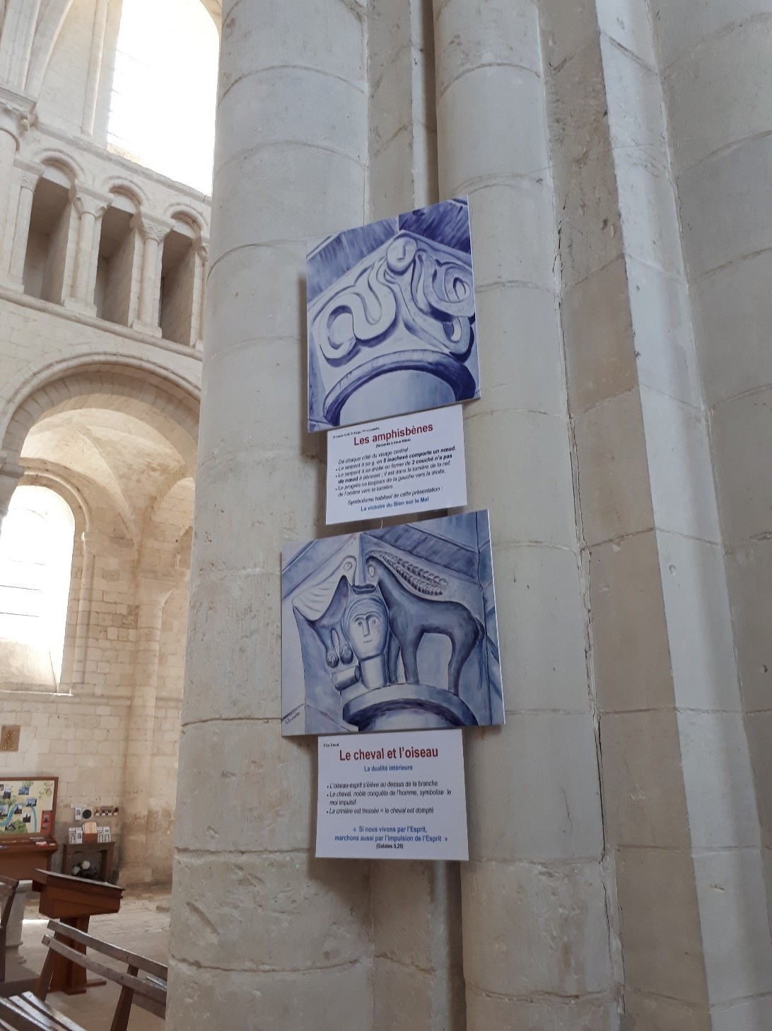 Dans l’abbatiale une quinzaine de chapiteaux vus de près accompagnent le chemin de Vie à découvrir.