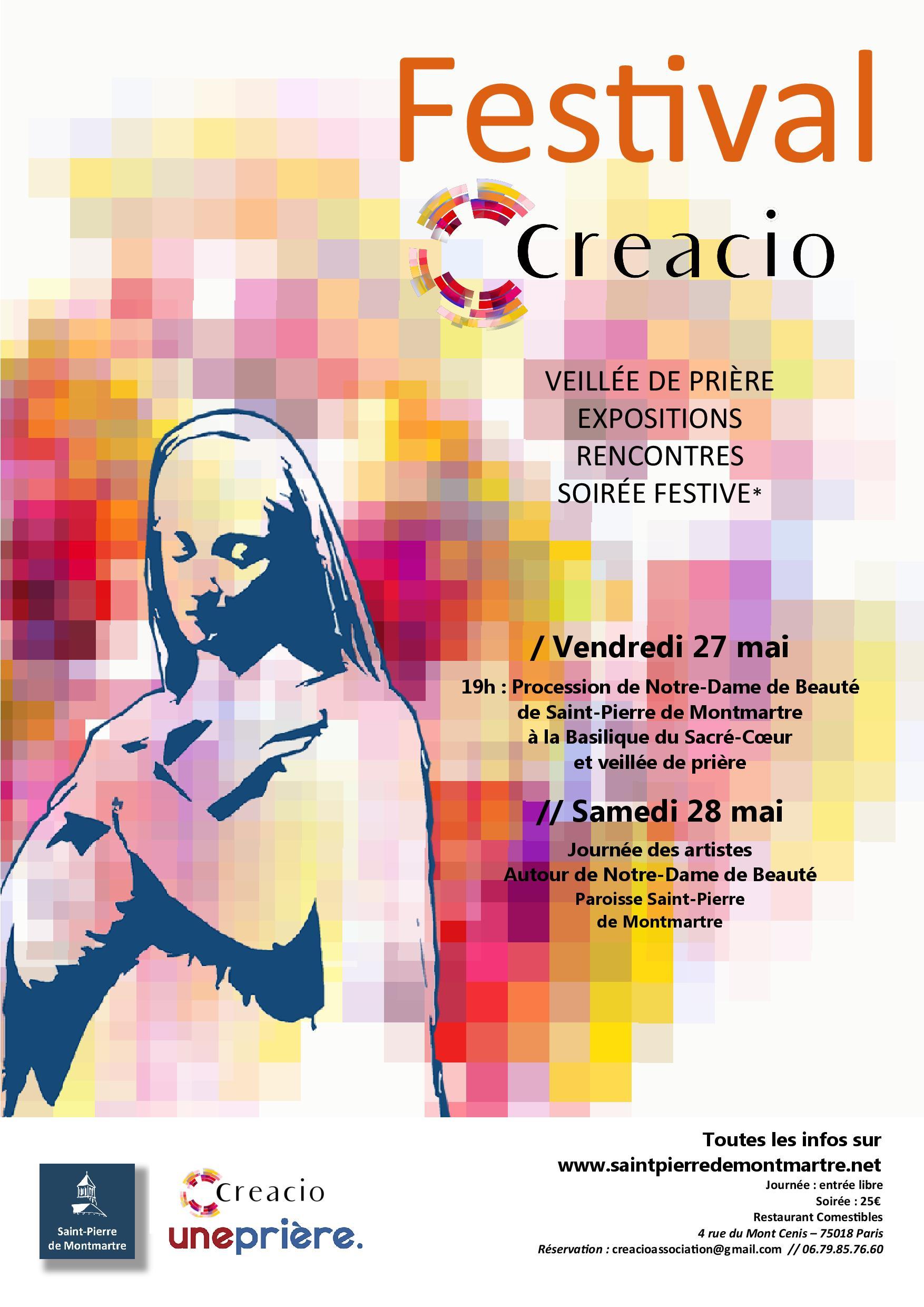- Festival Creacio : Double exigence : impliquer les populations de Montmartre et revendiquer une ambition artistique susceptible de recueillir une audience nationale et internationale. Ce Festival aura lieu à St Pierre de Montmartre dans l’église, les salles paroissiales et les jardins les 27 et 28 mai 2016.