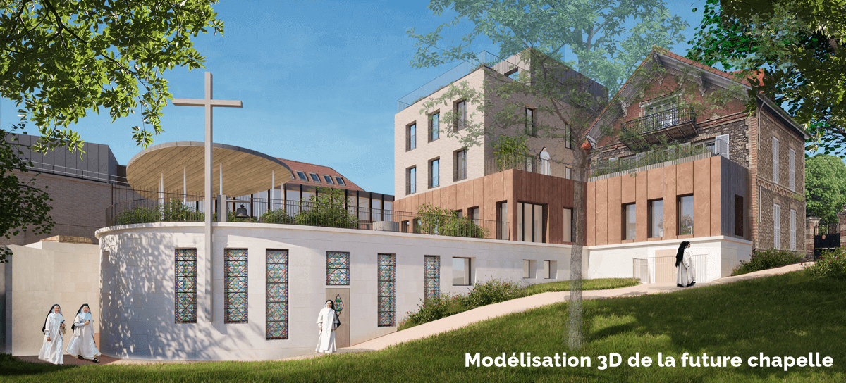 Cette nouvelle chapelle de 150m2 sera semi-enterrée et orientée. Elle pourra recevoir 3 à 4 classes en plus des Mères. Accessible de l'école et du couvent, ce bâtiment sera un lieu de prière commun aux élèves et aux Mères, véritable espace de communion pour toutes les générations qui passeront entre les murs de l'Institution.
