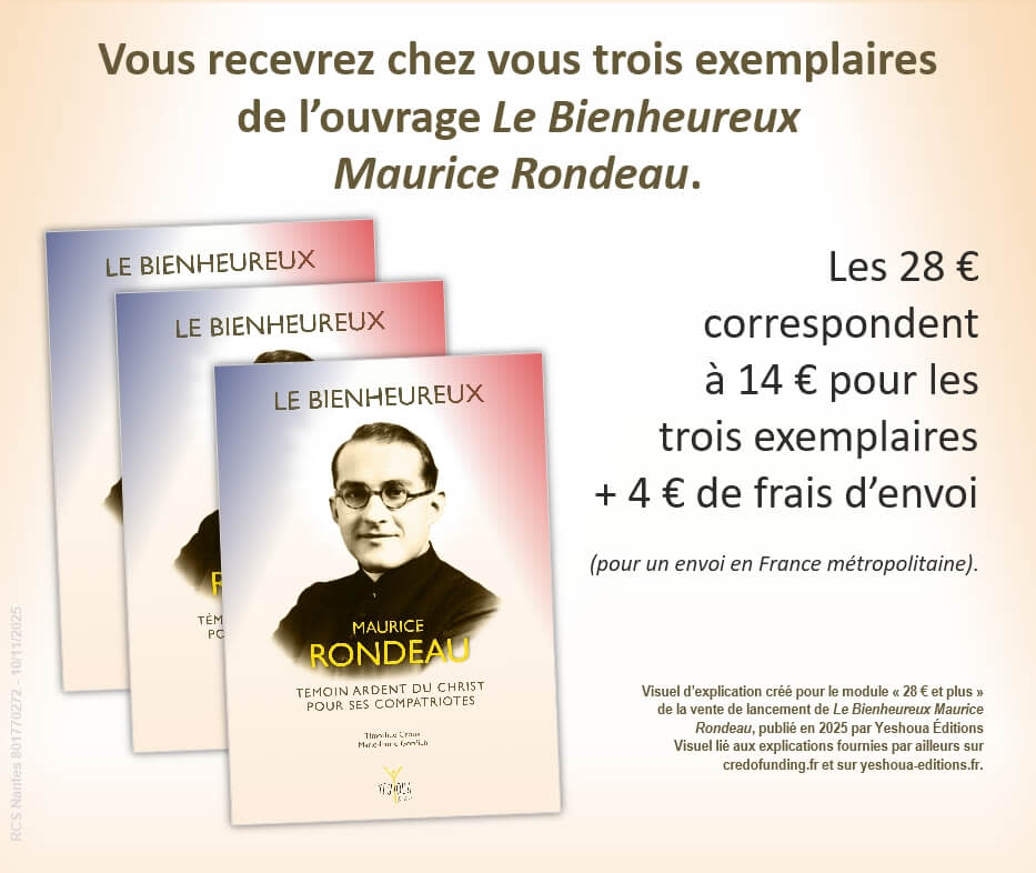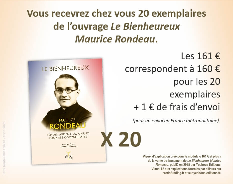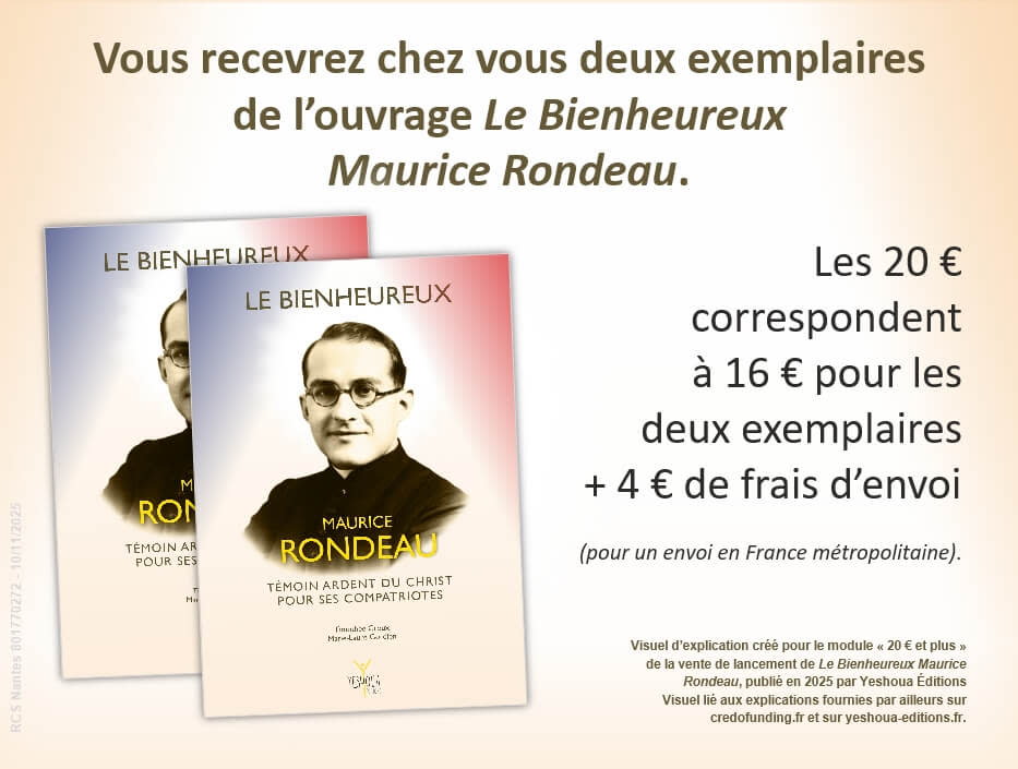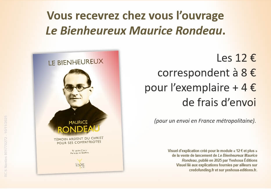 Par cette vente de lancement de l’ouvrage Le Bienheureux Maurice Rondeau sur Credofunding, découvrez sa vie, son sens missionnaire et son courage. Maurice Rondeau est devenu, spécialement pour nous catholiques français, un intercesseur à qui nous pouvons confier nos intentions de prière.