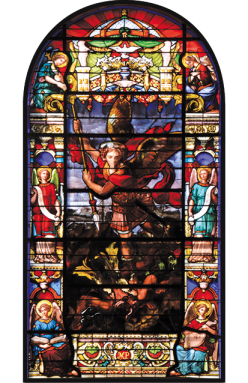 Départ de Givors devant le vitrail de saint Michel dans l’église Saint-Nicolas.