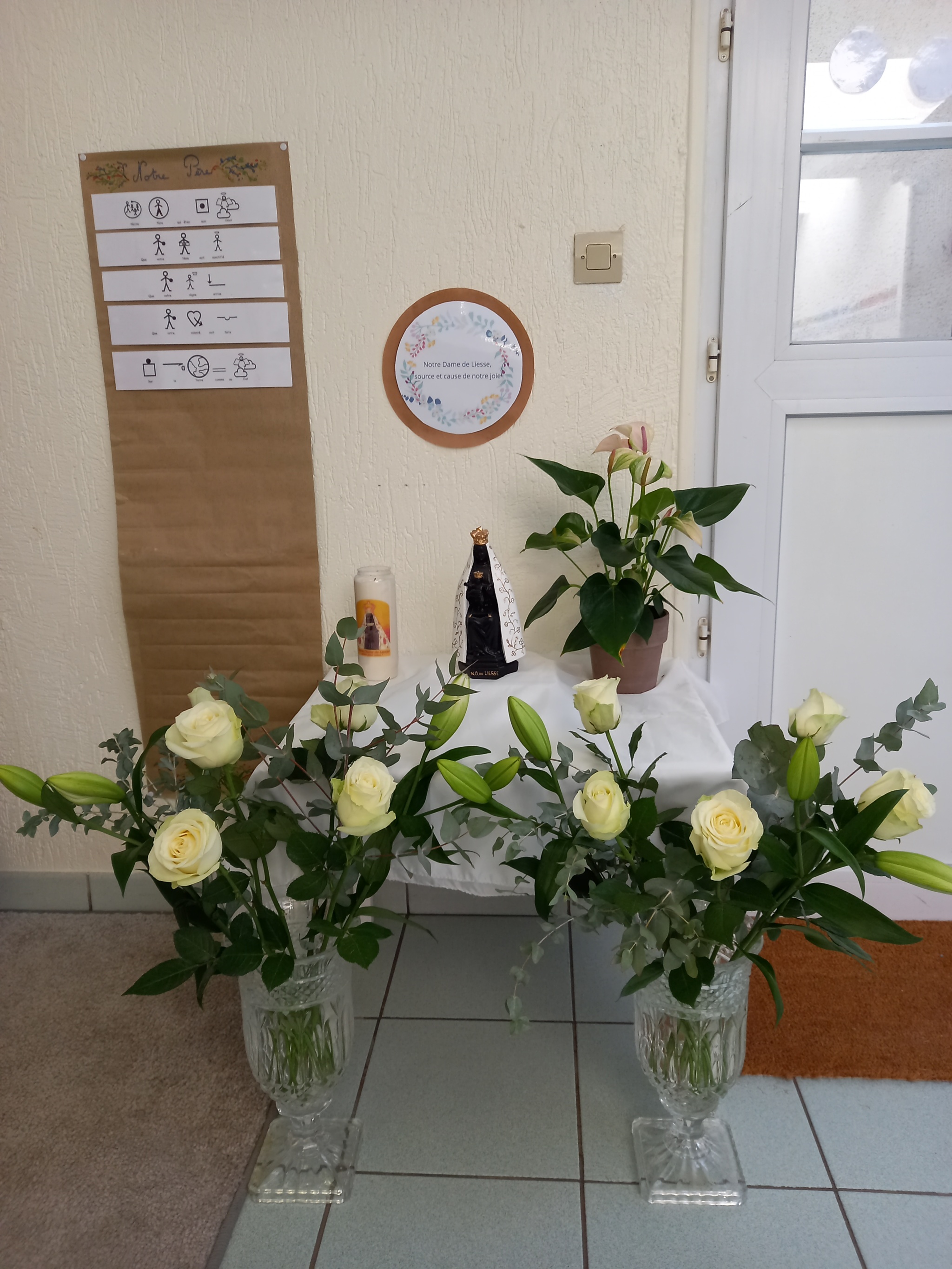 Après les congratulations d'usage, le Père José bénit la statue de Notre-Dame de Liesse, reproduction fidèle de l'originale, tenue avec attention par Christy. Puis Notre-Dame est installée sur l'oratoire préparé et fleuri pour l'accueillir dignement comme Reine et Mère de la classe, accompagnée par l'hymne à Notre-Dame de Liesse chanté par les collégiens. La prière du collège au Sacré-Cœur vient clore cette courte mais très belle cérémonie.