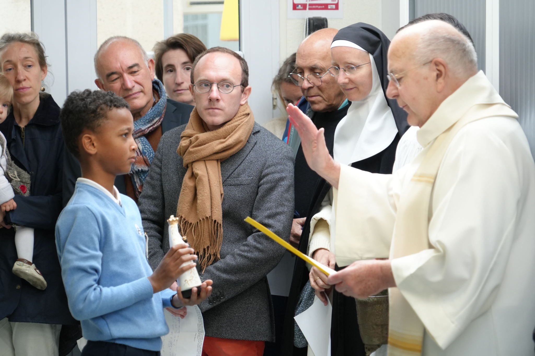 L'inauguration officielle rassemble autour de la Très Sainte Vierge Marie, sainte patronne de la classe, la direction du Conseil d'Administration et de l'établissement, les collégiens, les grands donateurs qui ont pu se rendre présents, les parents, un professionnel de santé, le corps enseignant du collège, l'aumônier du collège, Monsieur l'abbé Maître et le Curé de Fontainebleau, le Père José Antonini.