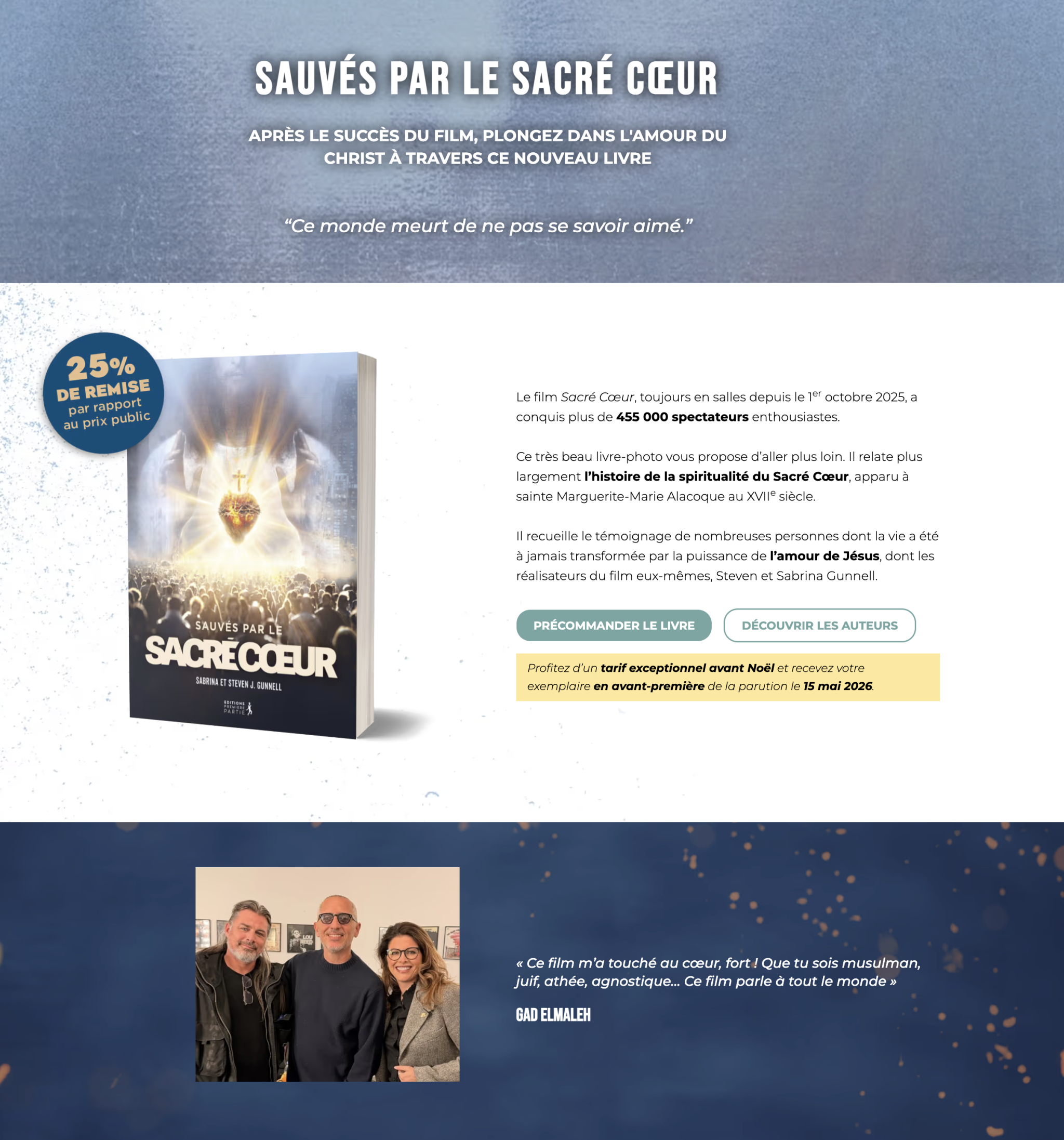 On ne peut pas ne pas vous en parler !❤️‍🔥 Le film Sacré Cœur, toujours en salles depuis le 1er octobre 2025, a conquis près de 465.000 spectateurs enthousiastes. Ce très beau livre-photo vous propose d’aller plus loin. Il relate plus largement l’histoire de la spiritualité du Sacré Cœur, apparu à sainte Marguerite-Marie Alacoque au XVIIe siècle. Il recueille le témoignage de nombreuses personnes dont la vie a été à jamais transformée par la puissance de l’amour de Jésus, dont les réalisateurs du film eux-mêmes, Steven et Sabrina Gunnell.