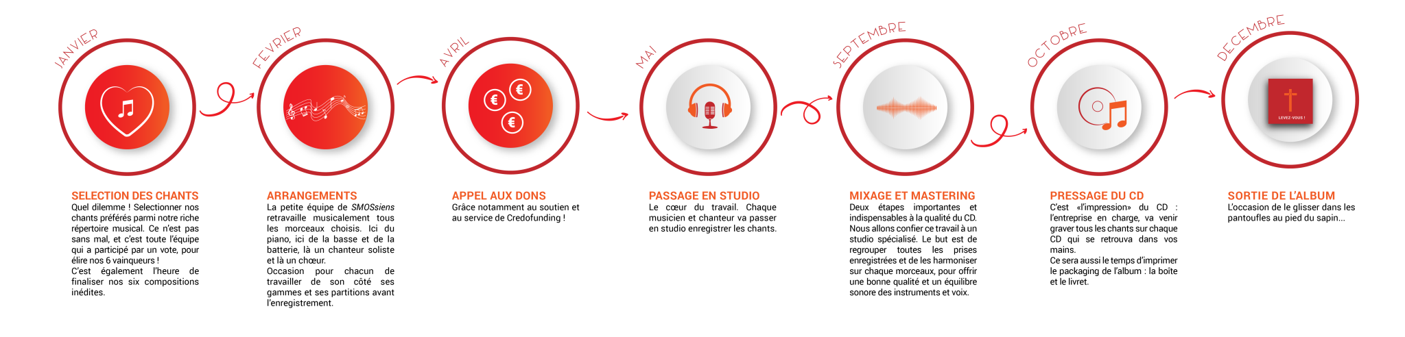 Parrallélement, notre graphiste a commencé à travailler sur la jaquette et le livret de l'album... Un petit indice : vous serez plongé le feu de l'Esprit quand vous l'aurez entre les mains! Autre challenge pour SMOS : réussir à réunir les 40 SMOSsiens que nous sommes pour une photos de groupe. Pas si facile.... Les devis pour le pressage sont en attente.