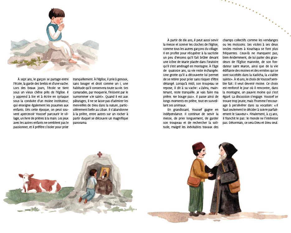 Né en 1828 au Liban, Youssef est attiré très jeune par la prière et la solitude. Mais c’est une rencontre déterminante avec un moine dans les montagnes qui le poussera à entrer au monastère, à 23 ans, prenant le nom de Charbel.