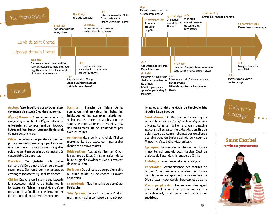 Le plus ? A la fin de chaque ouvrage, une frise chronologique replace le saint dans le contexte de son époque, un lexique vient expliquer les mots compliqués et une carte-prière peut être découpée pour être placée dans le coin prière !